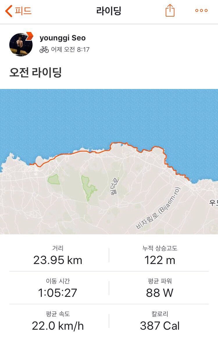 예전에 근무했던 직장에서 제주도로 자전거 여행을 떠난 적이 있었다. 일종의 워크숍이었는데, 자전거 국토 종주를 한 번 해봤던 경험이 있어서 제주도 면적이라도 결코 쉽지 않을 거라는 예상을 했었다. 그런데, 제주도로 떠나기 전에 몇몇 동료들은 '자전거 종주, 뭐, 그깔꺼..'라고 얼굴에 그려져 있는 거 같았다. 새벽 인천공항에 모인 후 간단히 커피 한 잔씩 할 때, 한 외국 유학파 출신 형이 이전에 미국고등학교에서 미식축구를 해서 하체가 어쩌고 저쩌고 하시길래, 나는 '군대에서 행군해봤어요? 행군이라고 생각하면 돼요.'라고 간단히 조언해주고 2박 3일의 여정은 시작되었다.