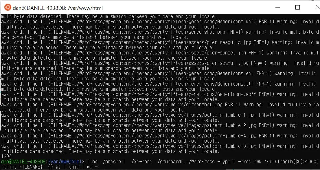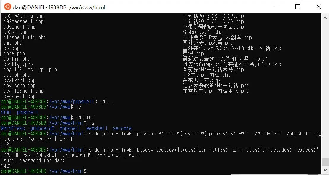 모수인 320 개의 3 배를 초과하는 것(1121 개)으로 상당수의 오탐이 포함되어 있는 것을 확인할 수 있고, 또한 각 키워드별로 탐지(위의 화면 맨 마지막 명령에서 해당 키워드만을 검색하여 추출)되는 개수도 추출 가능하다. 다음은 디코딩 함수(base64_decode)와 웹쉘에서 사용빈도가 높은 함수(str_rot13)를 이용하여 탐지하는 방법이다.