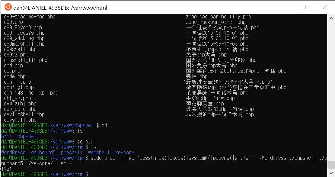 위에서 일단 웹쉘의 대표적인 기능으로 운영체제 명령 실행이 있는데, 이 실습은 PHP에서 사용이 가능한 운영체제 명령 실행 함수('passthru')를 이용하여 웹쉘을 탐지했다.