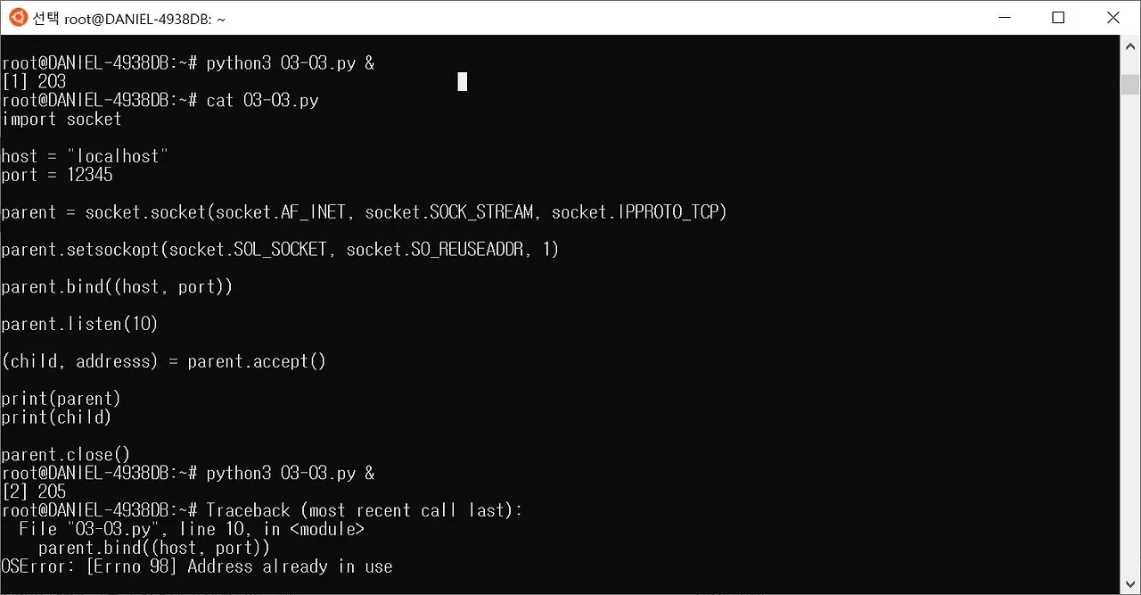 3-way-handshaking은 엄밀히 말하면 ACK 플래그를 담은 패킷을 출발지로부터 받아야만 TCP 3단계 연결이 이루지는 셰션 과정을 일컫기 때문이다. 아래는 파이썬으로 TCP 소켓 서버를 구현하는 순서이며, 본인의 랩탑에서 TCP 클라이언트(서버에 서비스를 요청하는 측) 접속이 이루어져 소켓 객체 내용을 연달아 확인한 화면이다.