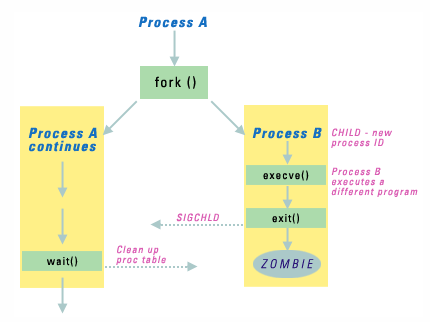 프로세스 B는 여기서 프로세스 A에 종속(부모 자식 관계)되어 있기 때문에 프로세스 B는 부모 프로세스 격인 프로세스 A로부터 상속받을 수 있다는 개념이 자바의 개발과정에서 언급된 것이고, 위의 도식에서는 프로세스 B가 종료된 것(프로그램 종료)을 모르고 wait() 함수를 호출하여 이제는 종속된 프로세스(자식 프로세스)가 없음에도 불구하고 기다리게 됨으로써 기존의 프로세스 B(자식 프로세스 ID)가 '좀비 프로세스'로 전락하게 되는 것을 보여준다.