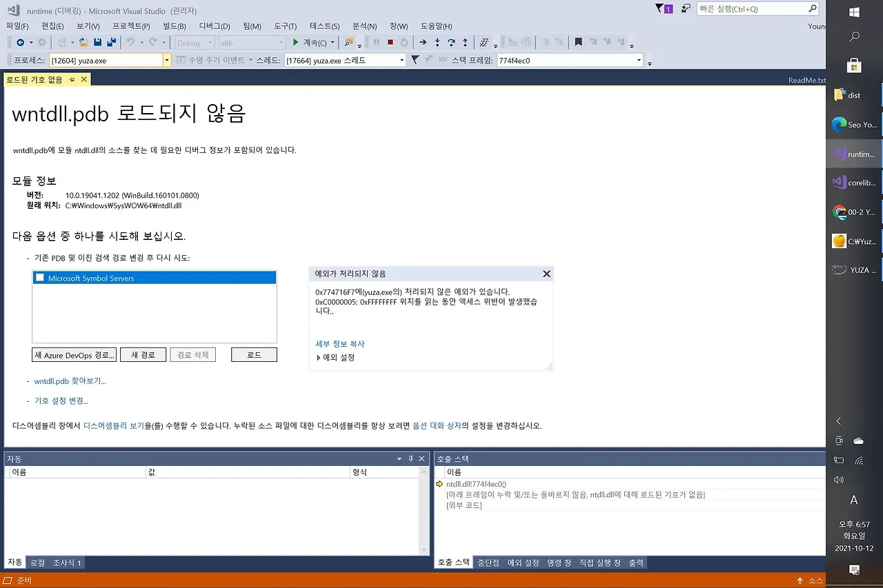 사운드가 지원 안 되는 것까지는 뭐 그렇다 쳐도, 화면은 확대가 안되나 하고 더블클릭을 너무 하였더니, 갑자기 디버깅이 필요하다는 팝업창이 떴고, 디버깅을 클릭하자 바깥에서 구동 중이었던 Visual Studio에서 해당 오류에 관한 페이지가 떴다.