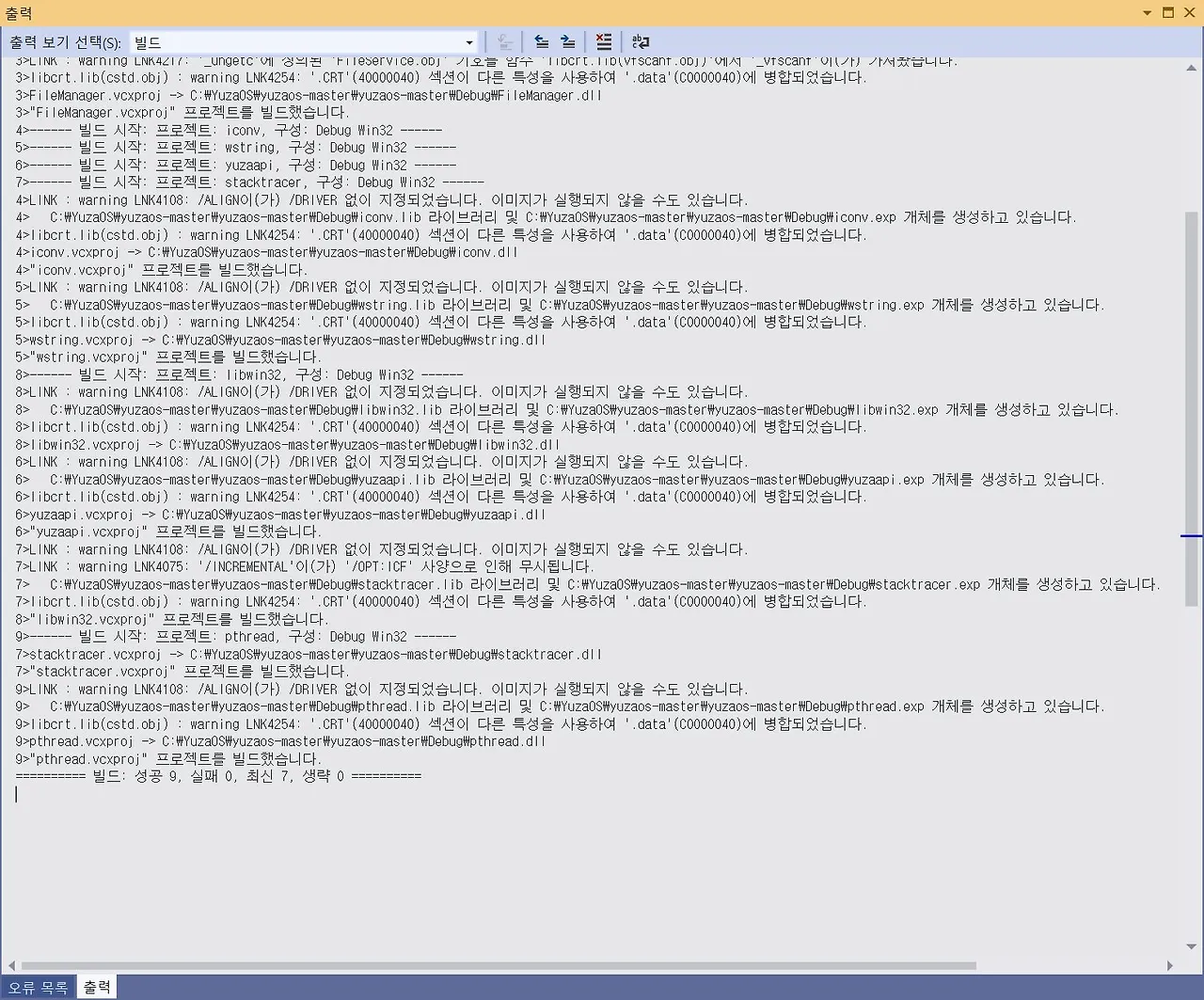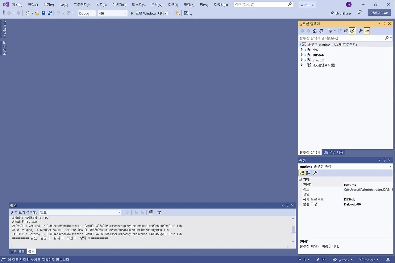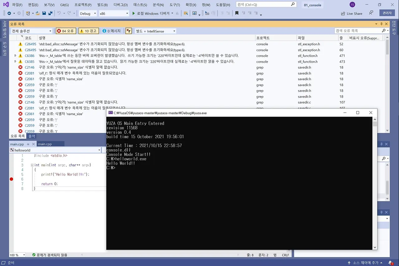 문제는 아래 runtime 솔루션 파일을 실행했을 때 4개의 프로젝트 중 libcrt가 로드되지 않았던 거였다. 화면 캡처를 일일이 한뒤 블로그에 업로드해서 리뷰했던 블로그를 공유했고 저자로부터 정확한 피드백을 받을 수 있었다. 모두 재빌드한 결과 두 가지의 솔루션의 프로젝트에서 여전히 실패가 발생했지만, 콘솔 커널의 시작 엔트리인 YuzaOSConsole 함수가 실행되었고(디버깅 모드) 'Hello, world!!'라는 실행결과를 출력하도록 프로젝트를 빌드시키는 것까지는 문제 없었다. 이제 다음 실습차부터 이론과 함께 차근차근 커널 코어로 접근해 볼 수 있겠다.