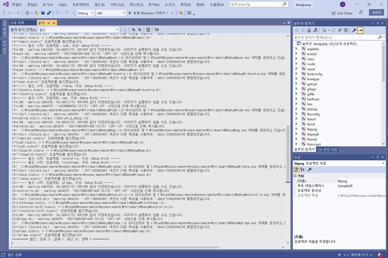 thirdparty 폴더로 이동해서 ThirdParty.sln을 실행한 다음 빌드해도 기존 20개 실패에서 1개 빼고 모두 성공된다. 일단 무시하고 다음 솔루션 파일들을 실행시켰고 재빌드했다.