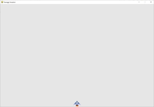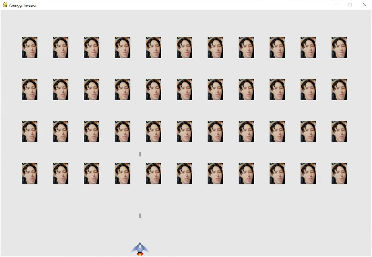 게임은 아래와 같은 그래픽과 본래 UFO였던 이미지를 나의 사진으로 바꾼 younggis(fleet, 전함)가 좌우로 움직이면서 아래로 내려가는 진행 절차를 가진다. 아직 Scoring(득점) 모듈은 빌드업하지 않아서, 일단 필자의 사진을 전부 다 맞추면 게임은 다시 시작되기만 한다. 만약 게임을 한 번 하고 싶으시다면 이 글의 맨 위에 링크 걸어둔 github 주소에서 폴더 전체를 다운로드해서 'invasion.py' 파일을 Python idle로 실행시키면 된다.