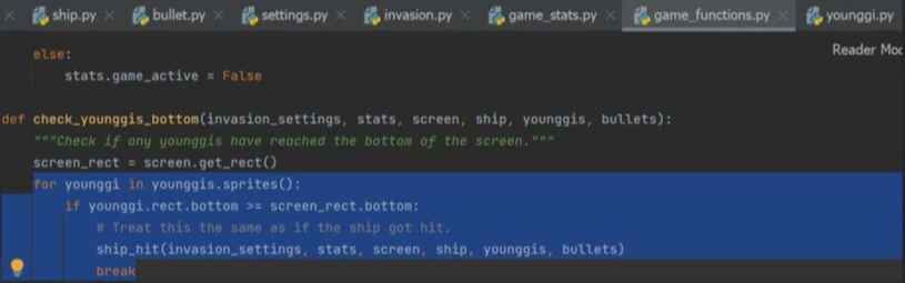반면 for 키워드의 코드 블록에 중첩(nested)되어 있는 if 키워드를 사용한 코드 블록의 예다. for 루프는 길이가 고정된 시퀀스의 원소를 하나씩 차례로 처리해야 하는 경우 편리하다(2021, 도경구). 조건 분기문인 if라는 명령을 통해, 침공한 필자(younggis)가 화면의 바닥에 닿으면 비행기의 생명(게임 횟수)이 하나씩 깎이는 ship_hit 함수를 호출하고 if문을 빠져나오는 제어구조도 아래 화면에서 확인할 수 있다.