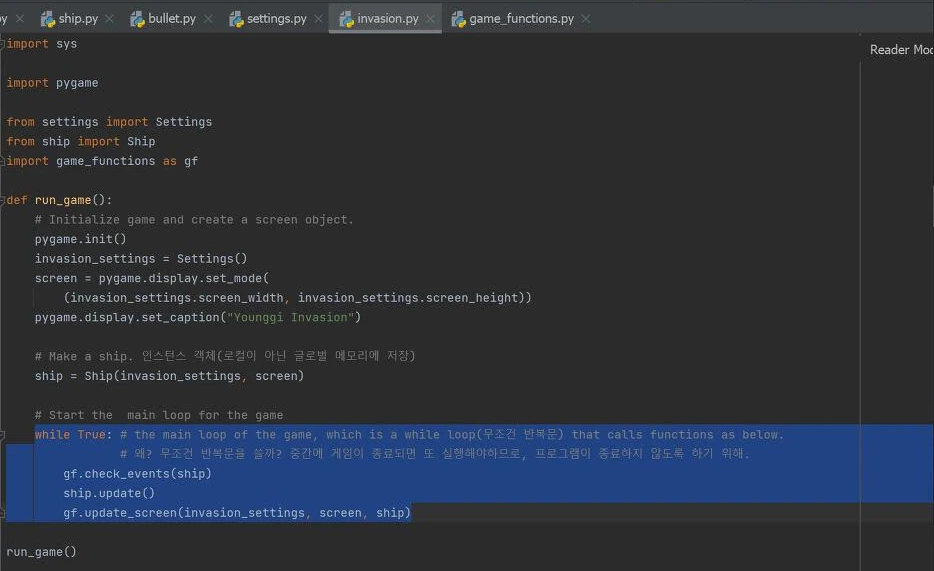 재귀로 사고하여 함수를 작성하는 원리를 다양한 자연수 계산 문제로 실습하고 개념을 공부하는 와중에 이 pygame이라는 라이브러리를 이용한 '영기 침공(Younggi Invasion)'이라는 프로젝트를 시작하였고, 2주간에 걸쳐서 이전과 달리 게임을 쉽게 완성하고 제어구조가 게임에서 쉽게 활용될 수 있다는 것을 알 수 있었다. 이 게임을 만드는 것을 소개한 저서에서는 while loop문이 들어있는 메인 파일(invasion.py)을 아래와 같이 설명한다.
