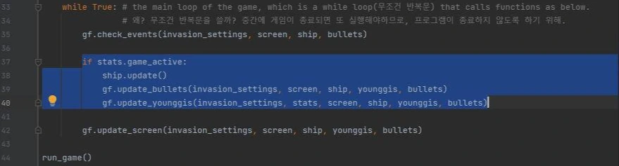 이후 게임 속 비행기의 생명이 3보다 작으면 화면을 정지(game over) 시키기 위해 아래와 같이 코드 변경이 되었다. if 키워드 아래의 코드는 게임이 진행 중(정지되지 않은 상태) 일 때만 실행 상태를 유지하도록 하기 위한 구문들이다. 일단 비행기 모듈(ship.py)의 업데이트 함수가 호출되고, 게임 기능 모듈(gf로 gamefunction의 별칭)의 미사일(bullets)과 영기(younggis) 함수가 역시 각 형식 파라미터에 해당하는 인자를 전달받으면서 호출된다.