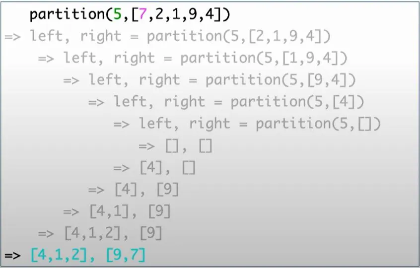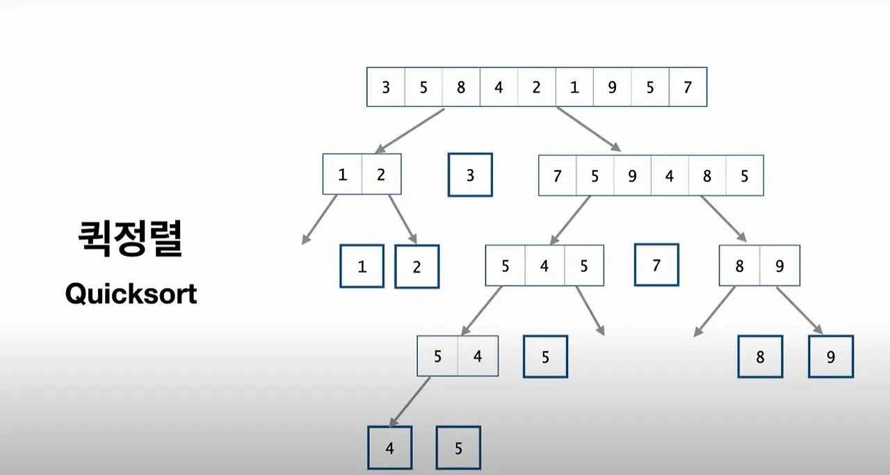 마지막에 합병 정렬 알고리즘의 merge 함수의 최종 리턴 값(xs + left + right)과 달리 퀵 정렬 알고리즘의 partition 함수는 크기 순으로 정렬이 안되어 반환(left: [1, 2] right: [4, 5, 9, 5, 8])된 거 같으나, pivot이 3 → 1 → 4 → 7 → 5 → 5 → 9 → 8의 순으로 고정되는 튜플(변하지 않는 값, 비가역성)로 던져줬기 때문에 위의 도식에서 보이는 마지막 진한 사각형의 튜플(메모리 상태, 로컬 메모리에 임시로 저장되어 있음)들처럼 좌우로 분할(partition-swapping**) 하여 left(pivot보다 적은 값)와 right(pivot보다 큰 값)으로 나눠서 quickSort 함수로 인자 값을 전달한다. 마지막으로 다시 quickSort함수에서 크기 순으로 정렬되어 있는 있는 튜플 값을 그대로 출력한다.