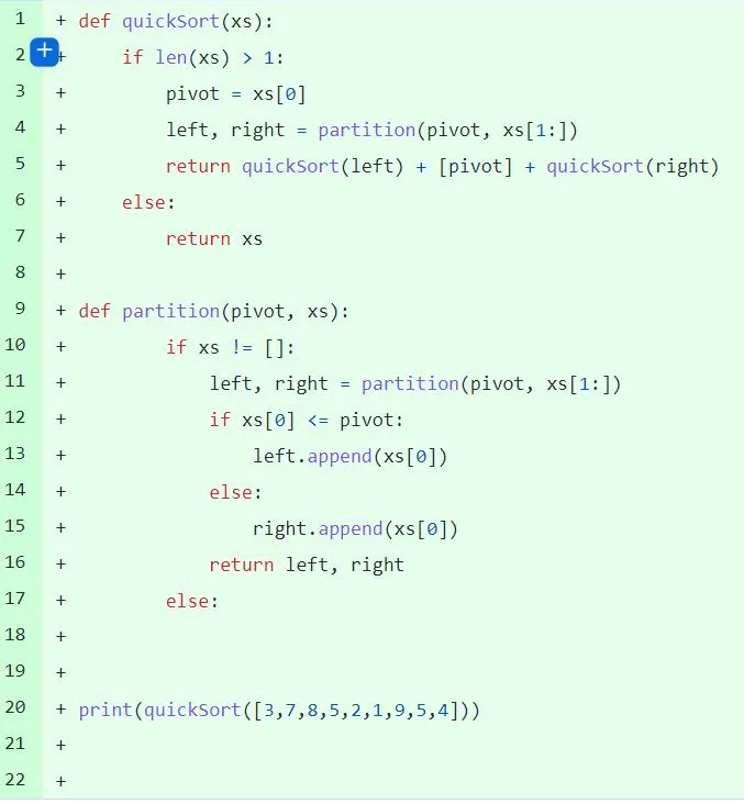 그래서 퀵 정렬은 최대한 균등하게 리스트를 나누어지도록 피봇 값을 잘 고르는 작업이 중요한데 여기서는 이 작업은 생략하고 코딩한 소스가 아래와 같다.
