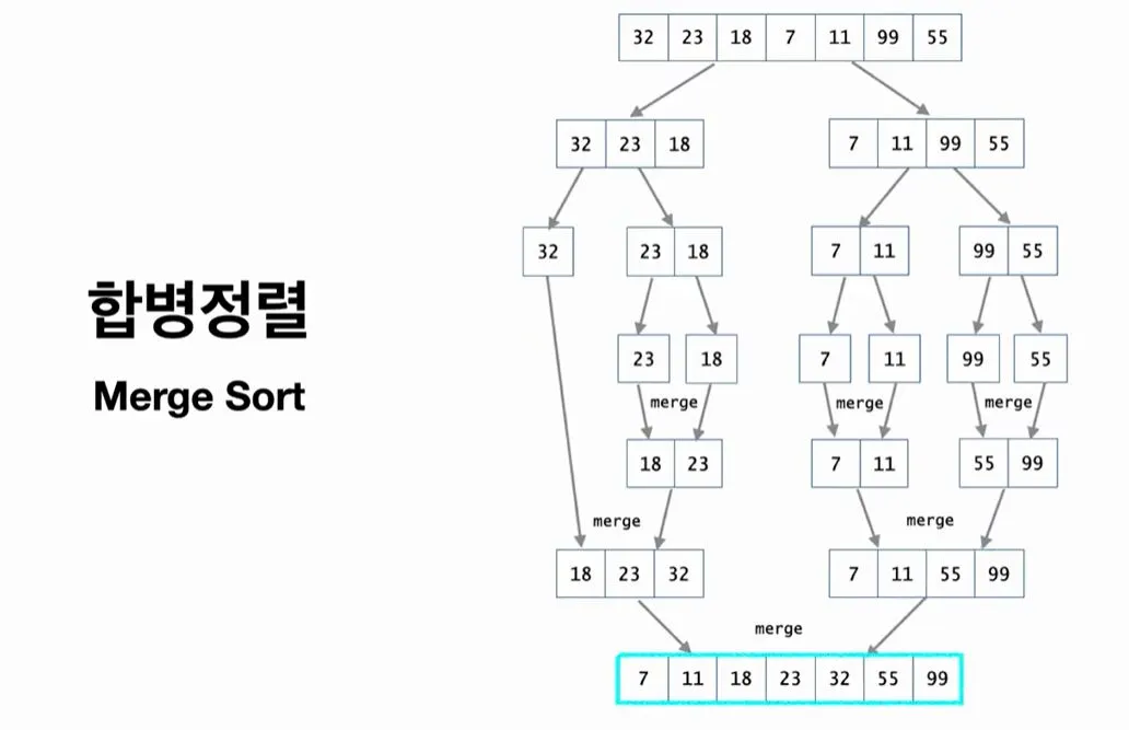 Merge sort는 리스트의 원소들을 일단 반(mid)으로 계속 쪼개기를 시작한다. 분할하는 동작을 구현한 함수가 아래 동영상의 소스에서 merge(left, right) 함수에 해당한다. 아래와 같이 총 7개의 원소를 가진 리스트라면 일단 왼쪽에 세 개, 오른쪽에 네 개로 나눈다. 한 개가 남을 때까지 나뉜 뒤, 작은 원소를 왼쪽으로 보내면서 합치기 시작한다. 이것을 병합 혹은 합병이라고 하는데, 최적화 알고리즘의 개념인 분할-정복*이 여기에 해당한다.