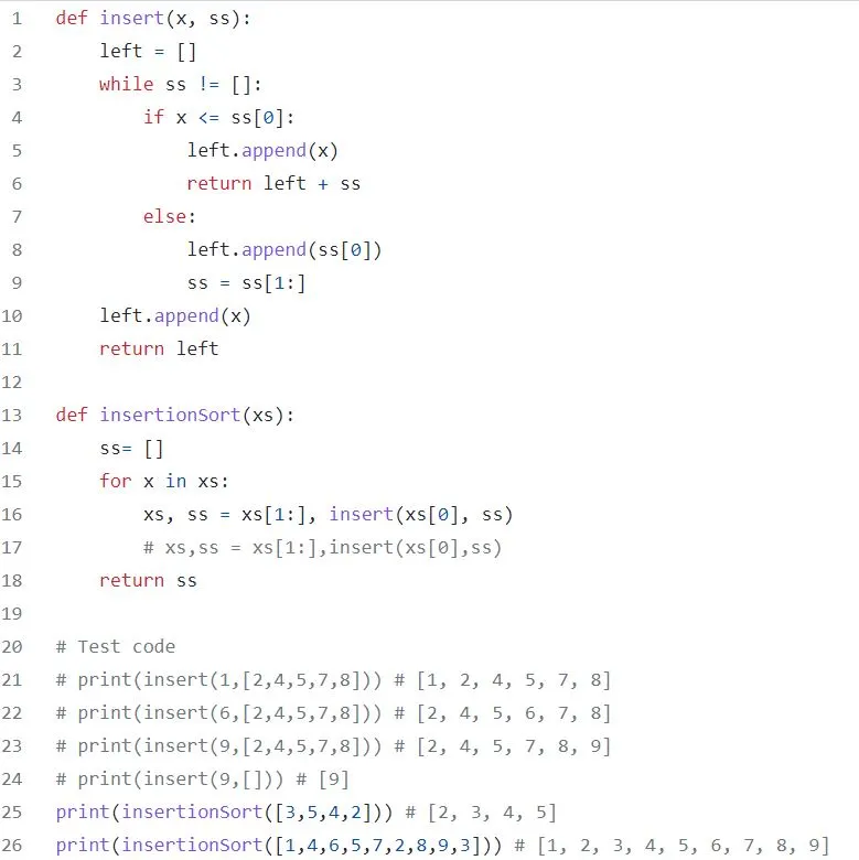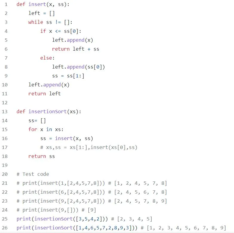 여기서 디버깅하면서 x로 선택되는 원소가 선두 원소가 아니라, 후미 원소라는 게 이전의 함수 버전과는 차이가 있다. 하지만, x가 후미 원소로 선택되더라도 어차피 insert 함수를 통해서 선두 원소는 가장 앞으로 appending 되므로 최종 결과로 리턴되는 ss의 값은 순차적으로 정렬된다.