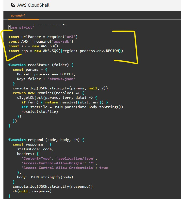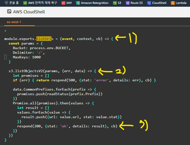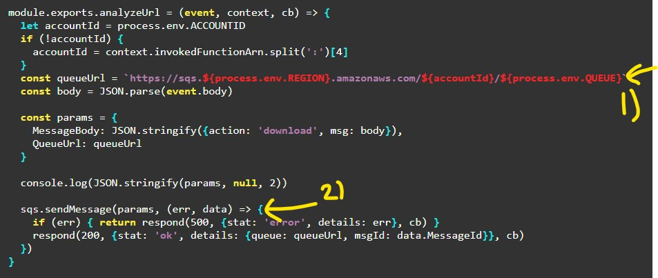 위의 handler.js 파일의 내부에서는 AWS SDK를 가지고 서비스에 필요한 객체, S3 및 SQS를 위에 마킹한 과정대로 생성한다.