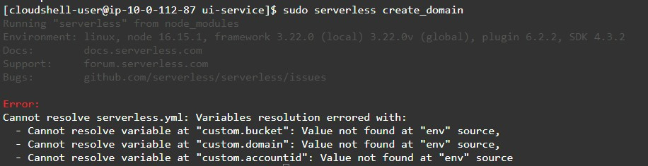 이제 곧바로 배포를 진행하기 위해 아래와 같이 커스텀 도메인 항목을 만들고 ui-service 배포를 위한 기본 도메인을 사용한다. 또한 기본 도메인에 대한 인증서와 그 인증서의 ARN 환경 변수를 설정한다.