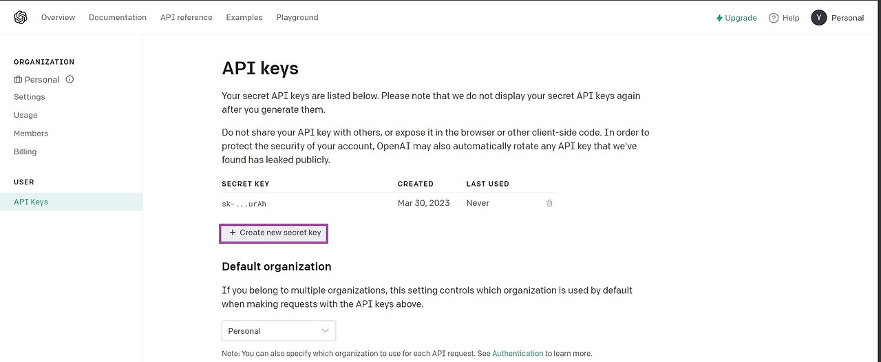 1_ 아래 화면에서처럼 API 키 페이지에서 '+ Create new secret key' 버튼을 누르면 API 키 암호가 새로 생성된다.