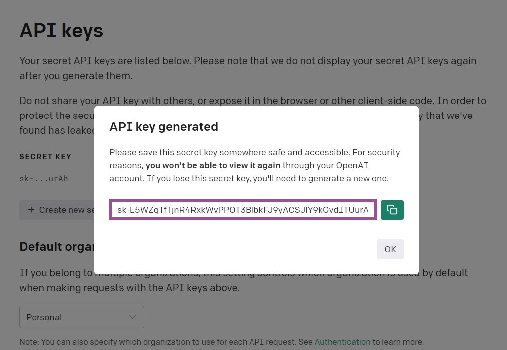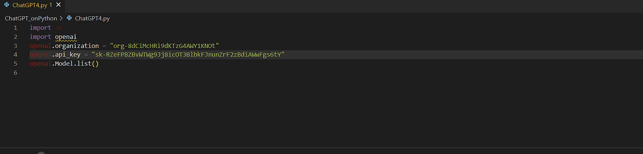 3_ 복사한 키를 아래와 같은 OpenAI에서 제공하는 소스 코드에서 붙여 넣기('하드코딩*')한다.