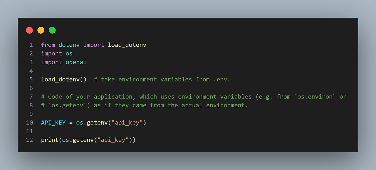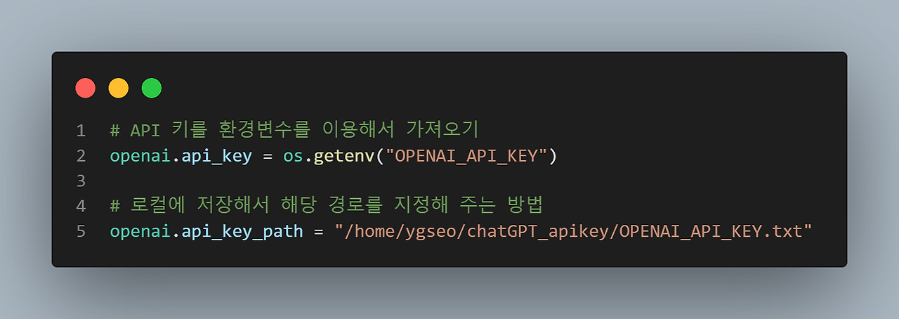 dotenv 모듈(라이브러리)로부터 load_dotenv를 임포트하고, .env파일과 .gitingnore라는 파일을 생성해서 여기에 환경 변수를 세팅하면, 윈도에 ChatGPT 인증을 위한 API_KEY 환경변수를 따로 만들지 않고도 소스 코드 내에서 안전하게 키 값을 보관할 수 있다. 또한 github repository에 소스를 커밋할 때 키 값이 든 파일을 업로드(push)시키는 것을 예방할 수 있다.