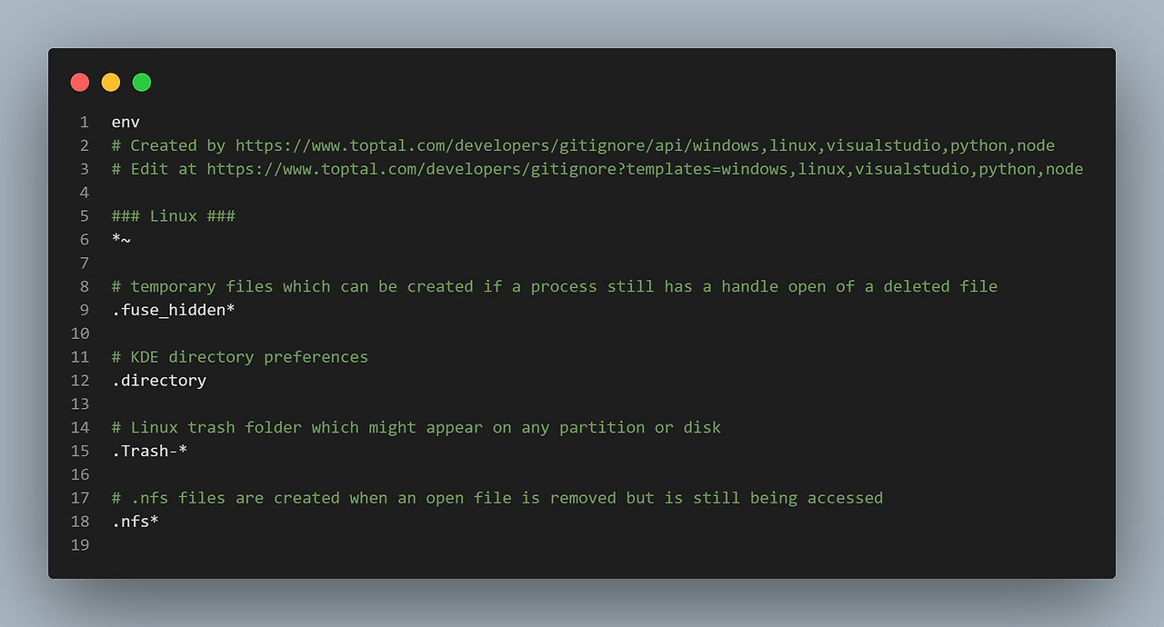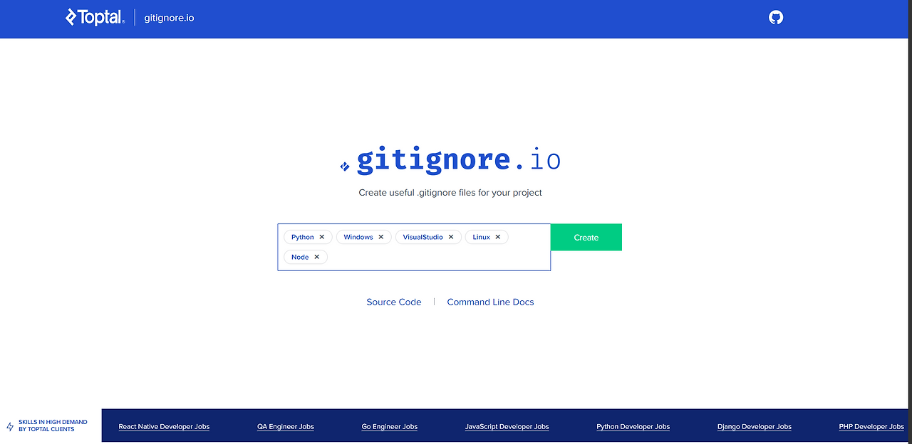 4) 추가로 gitignore.io 사이트로 가서 현재 자신의 런타임 환경에서 사용하고 있는 OS와 언어를 검색해서 외부로 노출이 되면 위험한 파일들을 아래와 같이 생성할 수 있다.