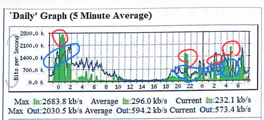 그래프에서 녹색으로 표현된 그래프가 들어오는 즉, 가상의 공격자가 많은 통신 요청(트래픽)을 보내고 있다는 것을 표현해 준다. 파란색의 꺾은선그래프는 나가는 통신 트래픽을 보여주는 데, 들어오는 트래픽량보다 현저히 적은 네 부분(파란색 동그라미)이 유입 트래픽량(빨간색 동그라미)에 비해서 아주 적다는 것을 보여준다. 공격의 징후들을 알 수 있는 시그널이다.