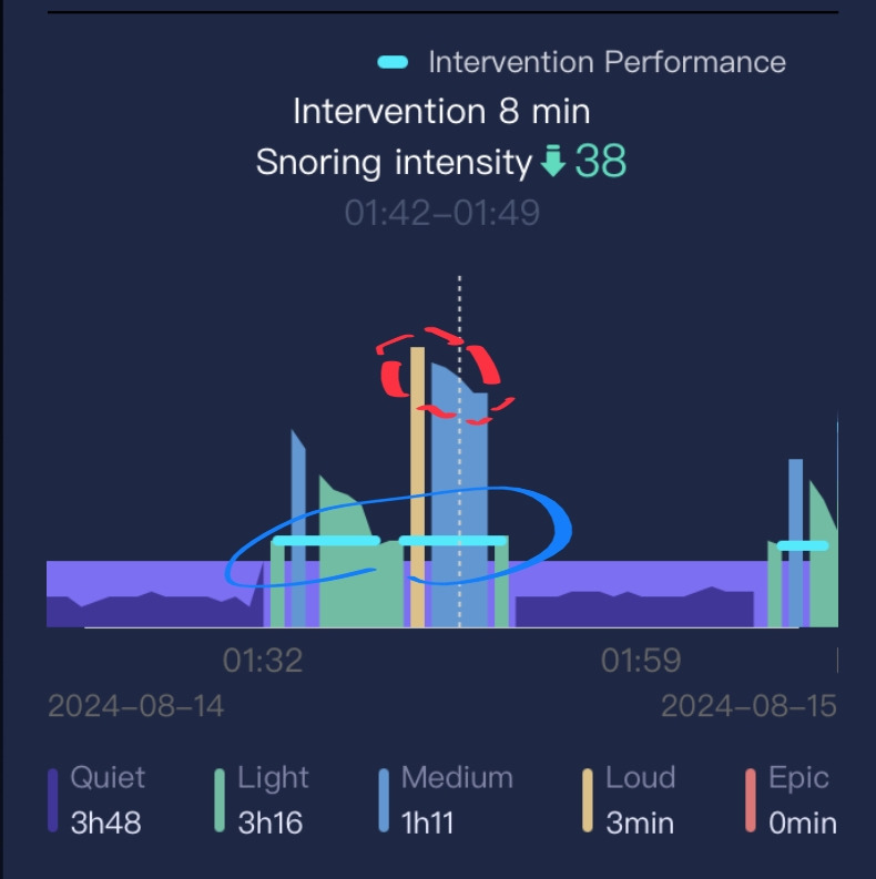 위의 노란색 막대그래프는 Loud(꽤 요란한 코골이)가 3분간 지속되었다는 것을 하단의 요목에서 알 수 있고, 파란색 막대그래프는 Medium(어머니의 코골이 소리 중 중간 정도, 참고로 Epic은 재앙 수준;)의 음량으로 공격의 강도가 탐지되었다는 것을 나타낸다. 이렇게 탐지된 코골이 공격으로 인한 배게의 개입(에어백 작동) 시간이 하늘색 가로 막대선이다. 대략적으로 8분간 어머니의 고개가 돌아가도록 배게의 퍼포먼스가 작동했으며, 코골이 강도를 38(세로 막대선의 정량적 수치)로 낮춰줬다고 묘사했다.