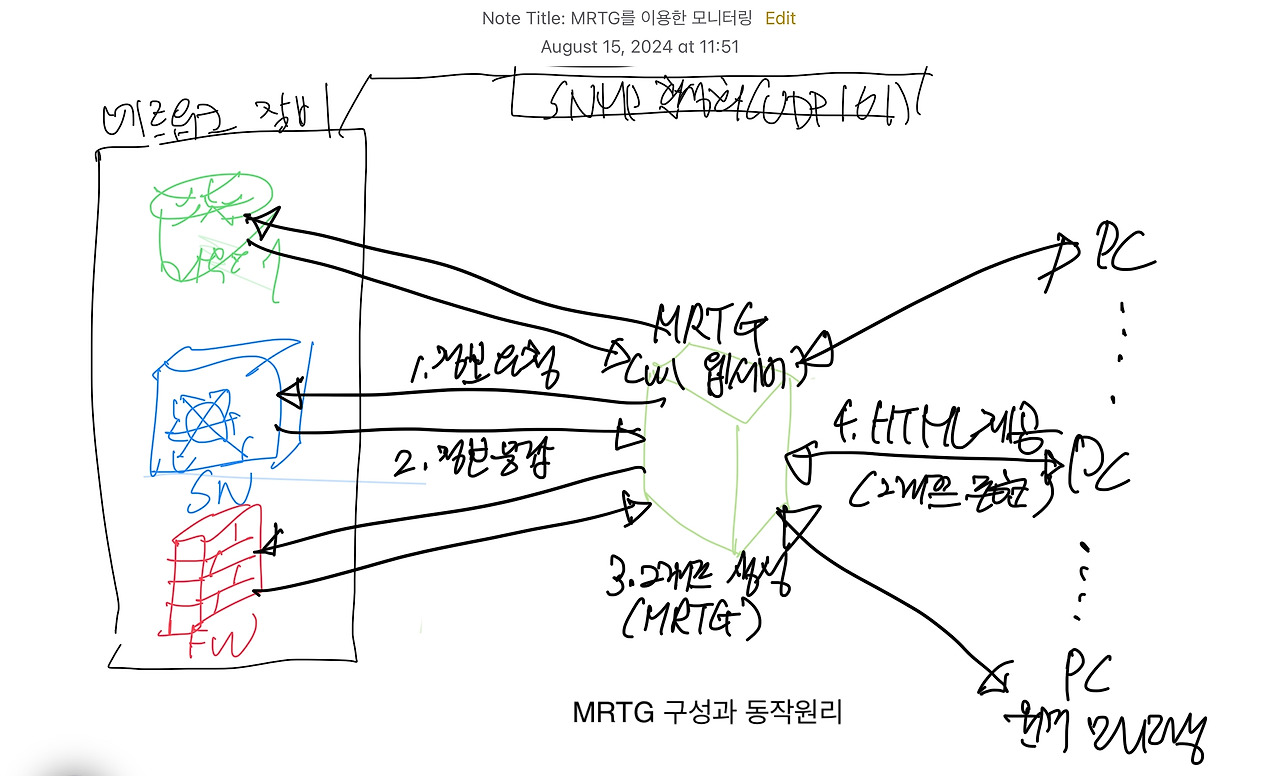 가운데 있는 MRTG(멀티 라우터 트래픽 그래퍼)라는 통신 장비(라우터나 스위치) 등으로부터 트래픽 정보를 이용, 그래프 이미지로 표현해 주는 프로그램을 통해서 아래와 같은 결과를 예로 얻을 수 있다.