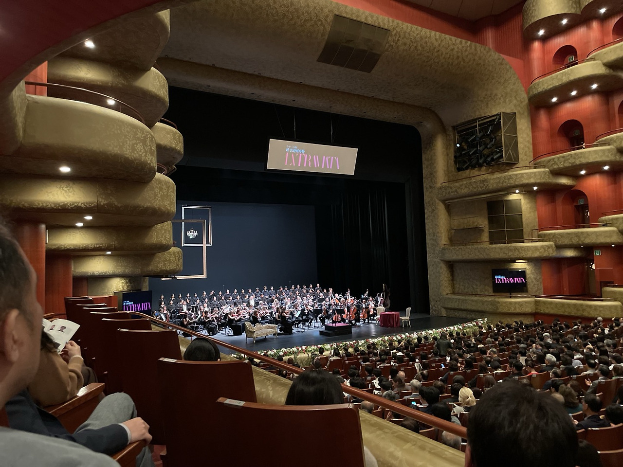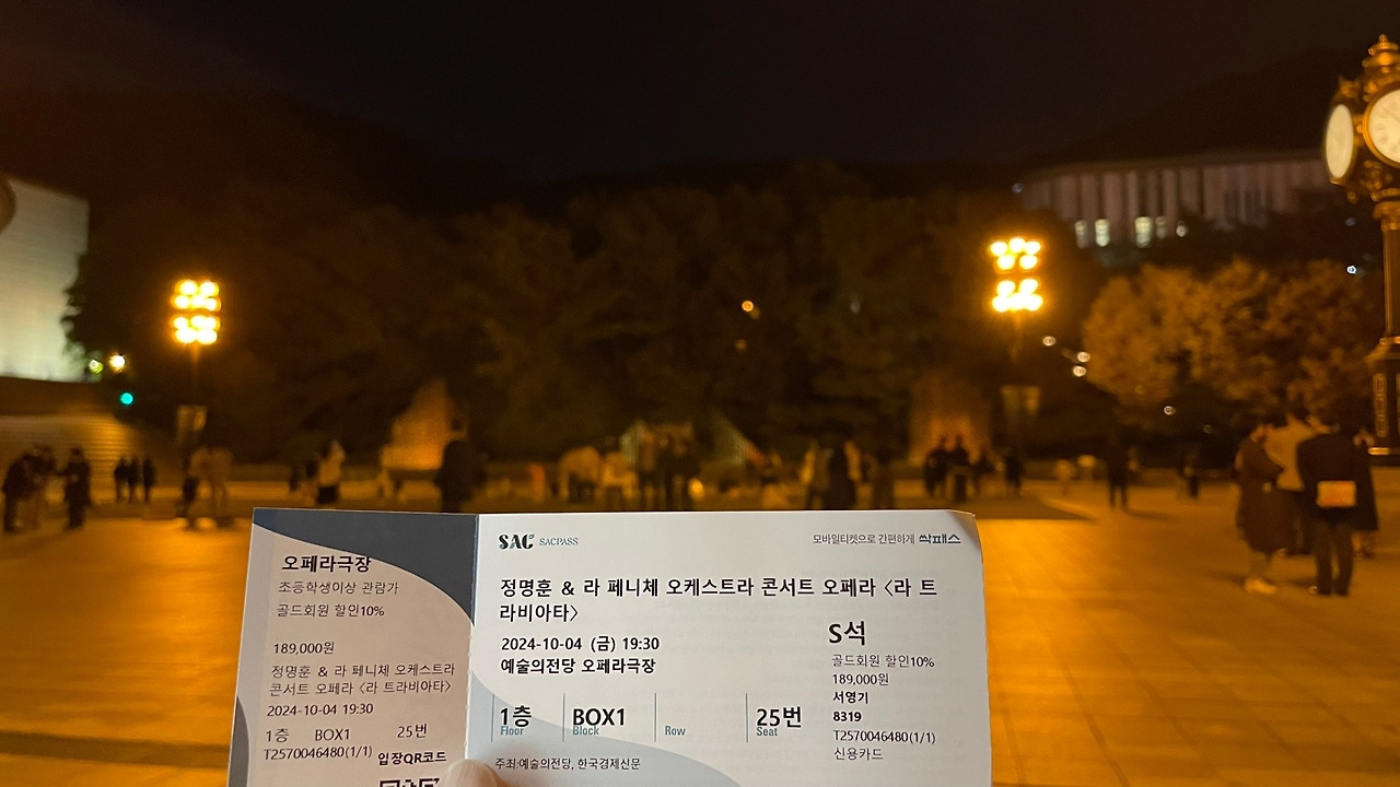 그래서 청소년기 때 매일같이 들었던 클래식 음악의 향연에 이어 대략 띠 햇수가 두 번(24년) 돌아서, 마흔에서야 다시 오페라 공연을 통해 클래식 음악을 찾았다. 티켓 가격은 S석이었는데 대략 십팔만원 정도였다. S석은 오페라 하우스 1층의 좌측 귀퉁이 박스 칸에서 대각으로 놓인 좌석이다. 관람할 때 엊그제 들은 피아노 연주 공연보다는 좌우의 관람객과의 간섭이 없어 좋았다.