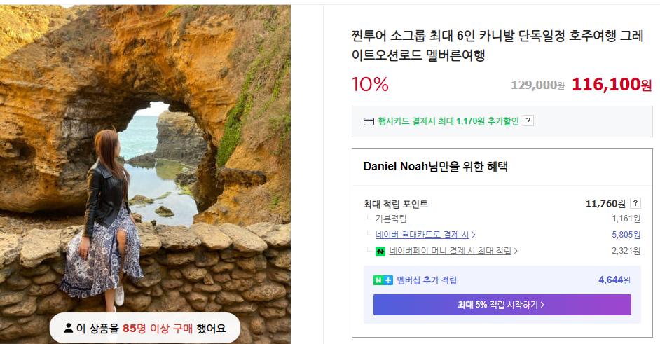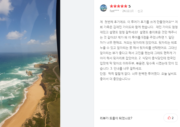 5인 패키지로 동승자가 적어서 그레이트 오션 로드 드라이브를 하기에 적당할 것 같았다. 본래는 국제운전면허증도 발급받았거니, 렌터카를 타고 드라이브 한 번 해볼까 했었다. 하지만 생각보다 달려야 하는 거리도 있고, 중간중간 잘 모르는 비밀 포토 스폿(뷰 포인트)은 가이드로부터 안내받을 수 있는 게 좋을 것 같아서 비싸지만 두 장을 질렀다.