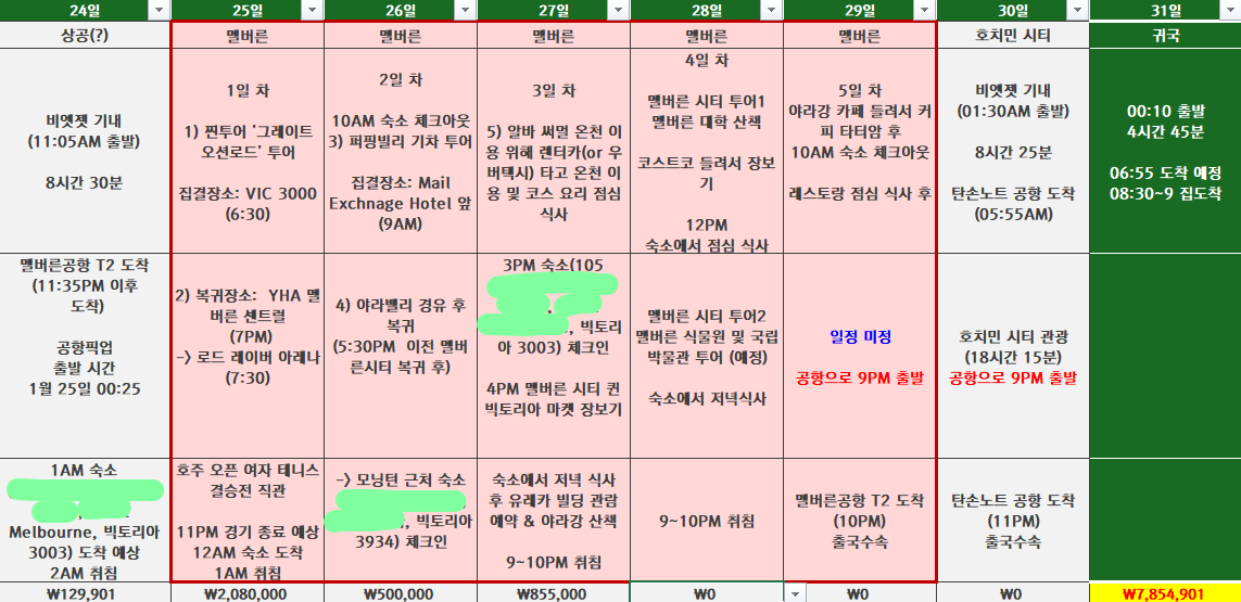 여행 계획은 미리미리 신경 쓰는 만큼 경비가 절감되는 것 같다. 이번 어머니 칠순 기념(비공식적, 주민등록상 나이로는 이순하고 다섯이지만)을 위한 멜버른 여행을 계획했었다. 한 달 여정도 호주의 멜버른 한인 커뮤니티(카톡 오픈채팅)를 통해서 많이 물어보고 현지의 정보를 입수한 덕분에 큰돈을 탕진하지 않게 되었다.