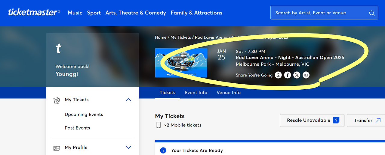 그리고 저녁에 멜버른 시티로 복귀 후(좀 일찍 복귀시켜 달라고 해야 할 듯, 왜냐면) 전 세계 테니스 4대 그랜드슬램 중 하나인 호주 오픈 경기를 보러 간다. 여자 결승전을 티켓 예매 게시한 첫날에 viagogo 사이트를 통해 구매했다(2인 도합 154만 원 넘음;).