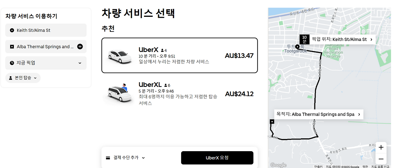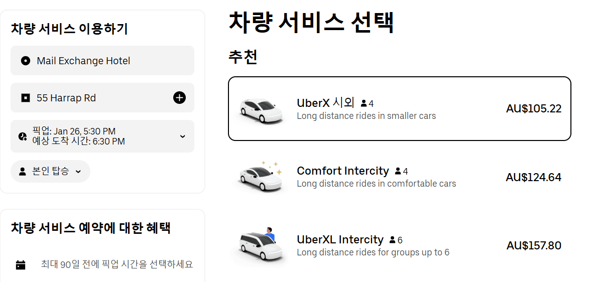 오후에 멜버른 시티로 다시 복귀하면, 여기서 간단히 저녁을 먹거나 요깃거리를 사서 이 날 예약한 모닝턴의 에어비앤비 숙소로 떠날 예정이다. 차로 1시간 20분 거리인데, 우버 택시 요금이 아래와 같아서 렌터가를 빌리러 가볼까도 고민 중이다(국제 면허증도 있으니!).