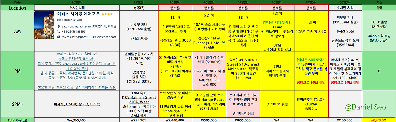 여행 일정 완료 여부 확인위와 같이 여행일정은 잘 마쳤다. 위의 여행일정표에서 노란색으로 마킹이 된 부분이 계획대로 전부 클리어한 부분이다. 2일 차에서 야라밸리는 여행투어사에서 시간 상 생략을 한 것 같았고, 3일 차의 유레카 빌딩은 어머니가 숙소에서 멜버른 전경이고 야경이고 다 보이는데 굳이 높은 빌딩 돈 주고 올라갈 필요 있겠냐 해서 생략했고, 야라강 산책도 2일 차 퍼핑 빌리 투어 후 돌아오는 길에 크라운 호텔의 '마그로'라는 초밥집을 찾기 위해 거닐었다.