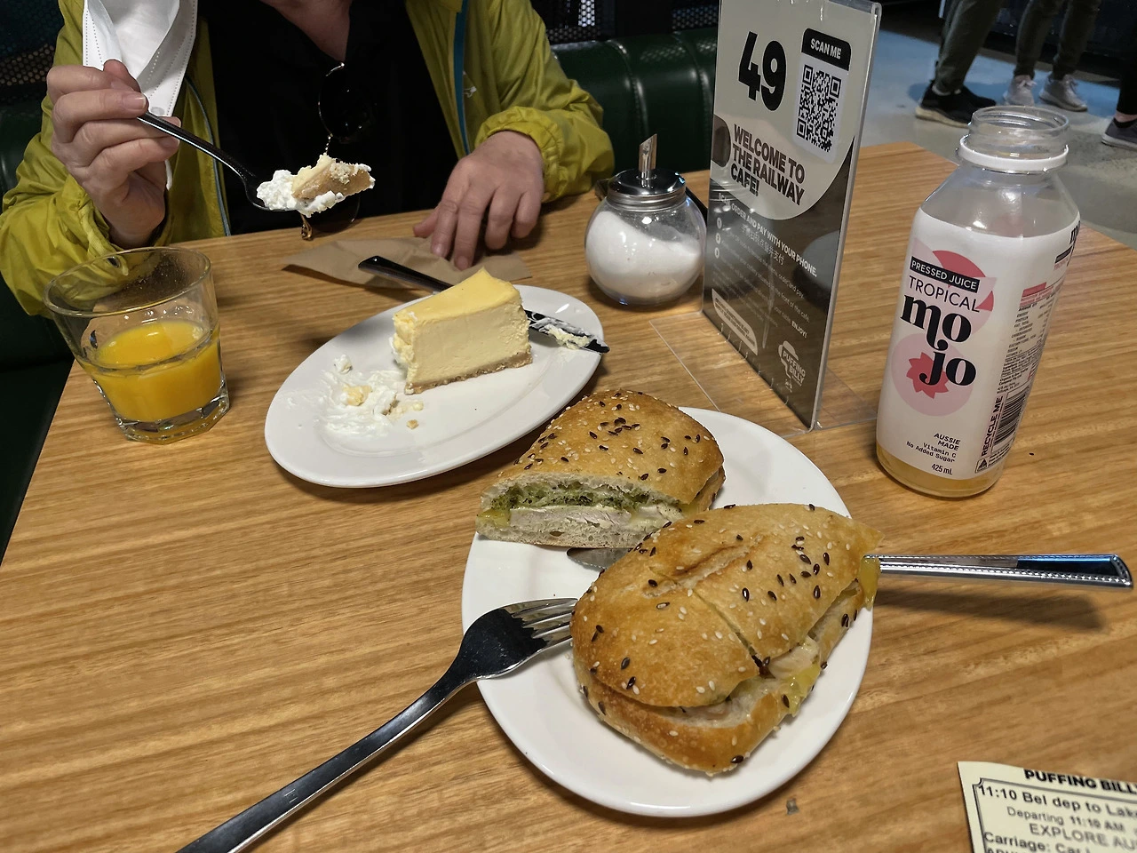 레이크 사이드역을 향하는 기차는 왼쪽 편에 타면 볼거리가 많다는 어제 가이드님의 팁으로 구경거리가 참 많았다 레이크 사이드역에 도착해서 관광객들을 위한 식당에서 한끼 먹음(치즈케익, 치킨 페스토, 음료 각각 15%씩 할인받아서 21,000원에 주문 / 기차티켓 제시해야 할인받음) 가족들이 피크닉 나와서 바베큐구이를 해먹거나 소확행하기에 딱 좋은 장소