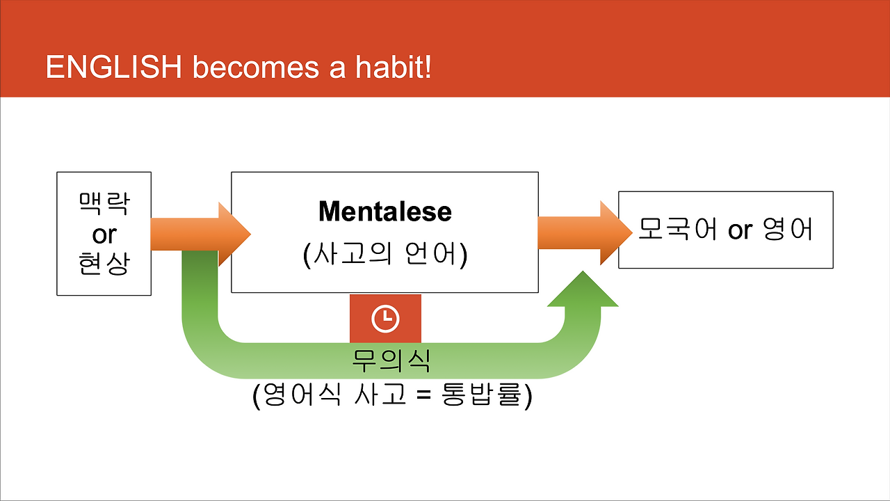 여러 영작문 책을 참조하면, 위의 문장 구조의 변환이 한국어 사고방식으로 영어를 영작한 경우(부사구 남발, 수동적인 표현)에서 네이티브 영어(사물 주어 사용, 5 형식 동사 원리)를 만드는 구조라고 한다. 여기서 바로 짚고 넘어가야 할 점이 우리가 두 번째 영어 문장을 번역한 뒤, 이 번역문장을 토대로 다시 영작할 때 두 번째 영어문장 그대로 나오면 되는데, 중간에 멘털리즈*(사고의 언어)를 거치면서 한국어식 사고방식으로 영작을 하기 때문이다.