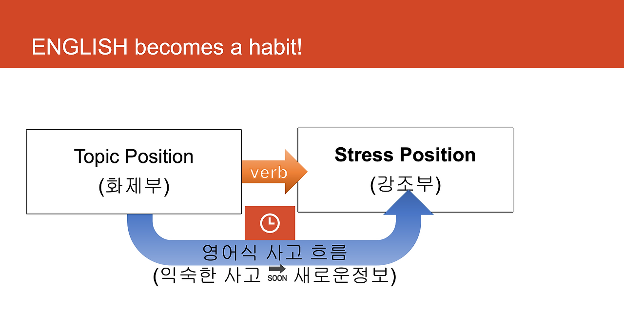 그런데 이 영작의 원리를 실제로 적용하려면, 떠오른 아이디어(한국어식 사고)를 영어로 작문부터 해야 하기 때문에 단 번에 적용하기가 쉽지 않다. 또한 대부분의 지식은 본인이 일찍이 스스로 터득해서 배운 게 아니라서 누군가의 이론으로 먼저 습득해야 한다. 그래서 계속해서 써보는 수밖에 없다. 이게 '습관'이다.