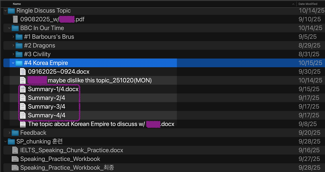그리고 필자처럼 '링글'이라는 원어민(캠브리지/옥스퍼드대 재학생 혹은 출신)과 1:1 스피킹 수업을 해보자. 필자는 이 한 토픽(The Korean Empire)을 네 부분으로 쪼개서 총 일곱 번(?)의 수업을 가졌다. 한 원어민 튜터(강사)와는 쪼갠 네 개를 하나씩 연속으로 수업했고, 마지막은 총정리(역사가 전공인 그 튜터에게 박사논문 주제로 추천해 줬다), 그리고 한국의 흑역사 중 하나인 '대한제국의 무기력한 주권 독립'에 대해서 다른 튜터와 두 번 더 가졌다.
