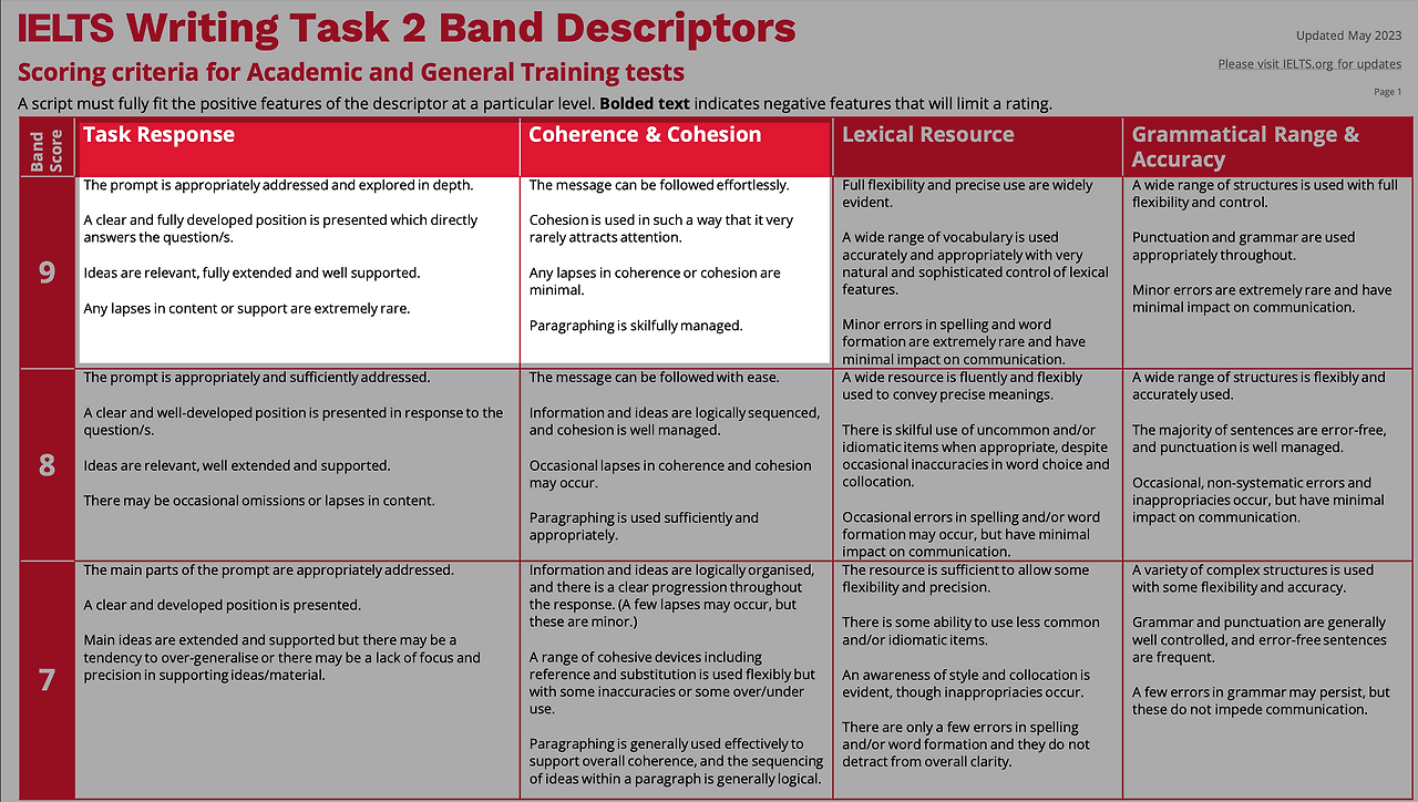 아래는 그 테스트에서 평가하는 채점 항목이다. 이러한 채점항목 중 Coherence & Cohesion (심층 & 표층결속성) 항목이 Task Achievement(주제 일관성) 항목 다음에 있는데, 이 결속성 항목을 자세히 보면,