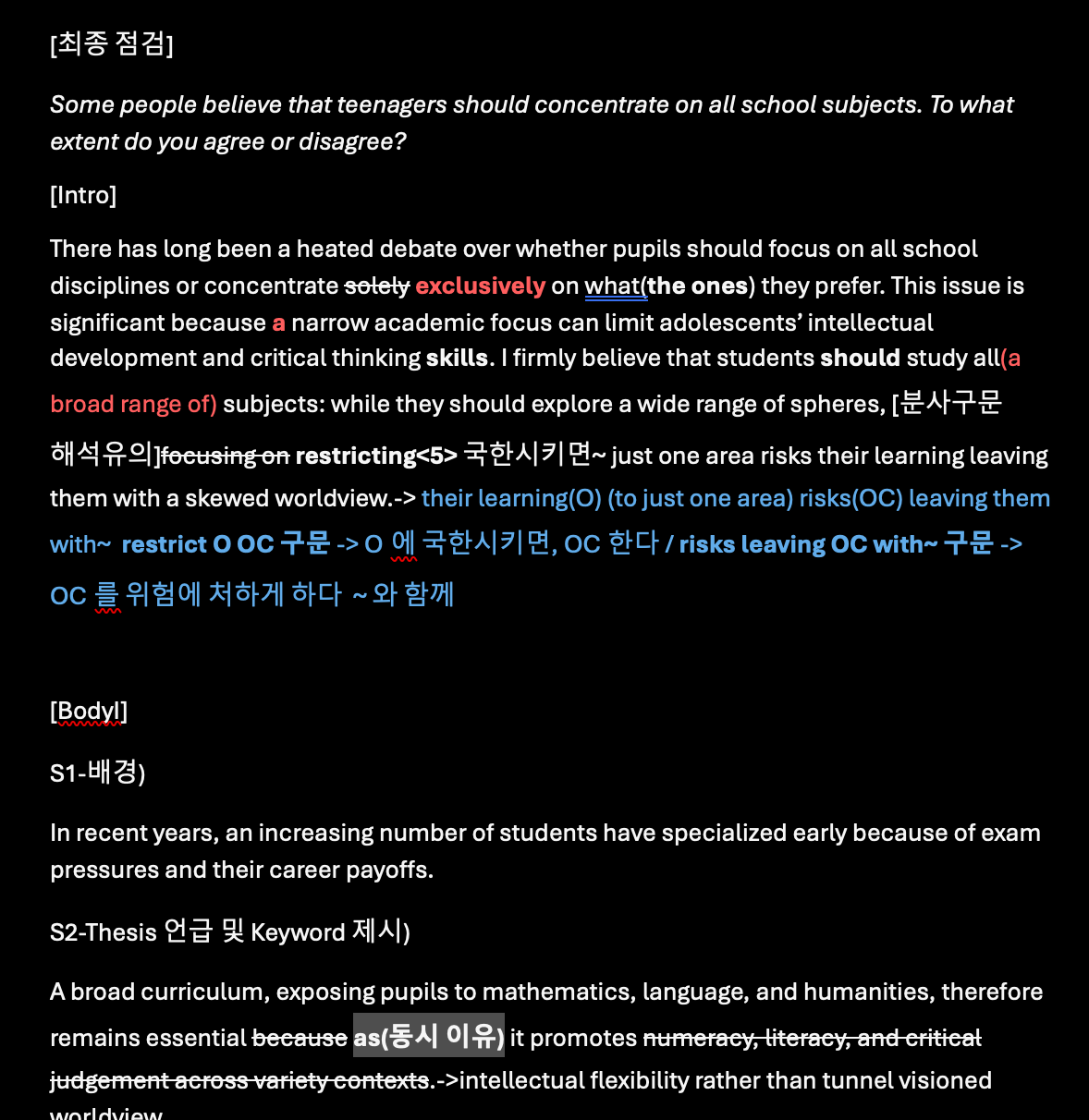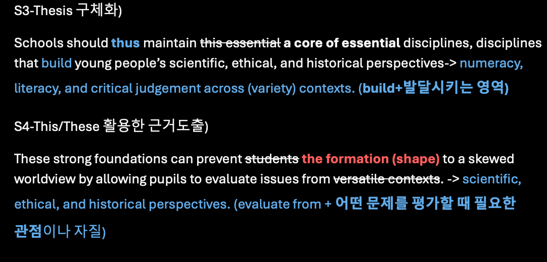 1) 배경설명 In recent years, an increasing number of students specialise early because of exam pressures and perceived career payoffs. 2) 논지(Thesis) 언급 A broad curriculum, exposing pupils to arts, sciences and humanities, therefore remains essential as it promotes intellectual flexibility rather than tunnel-visioned expertise. 3) 논지(Thesis) 구체화 Schools should thus maintain a core of essential disciplines, disciplines that build numeracy, literacy and critical thinking across contexts. 4) This/These 활용한 지지하는 아이디어 도출 This broad foundation prevents the formation of a skewed worldview by allowing pupils to evaluate issues from scientific, ethical and historical perspectives.