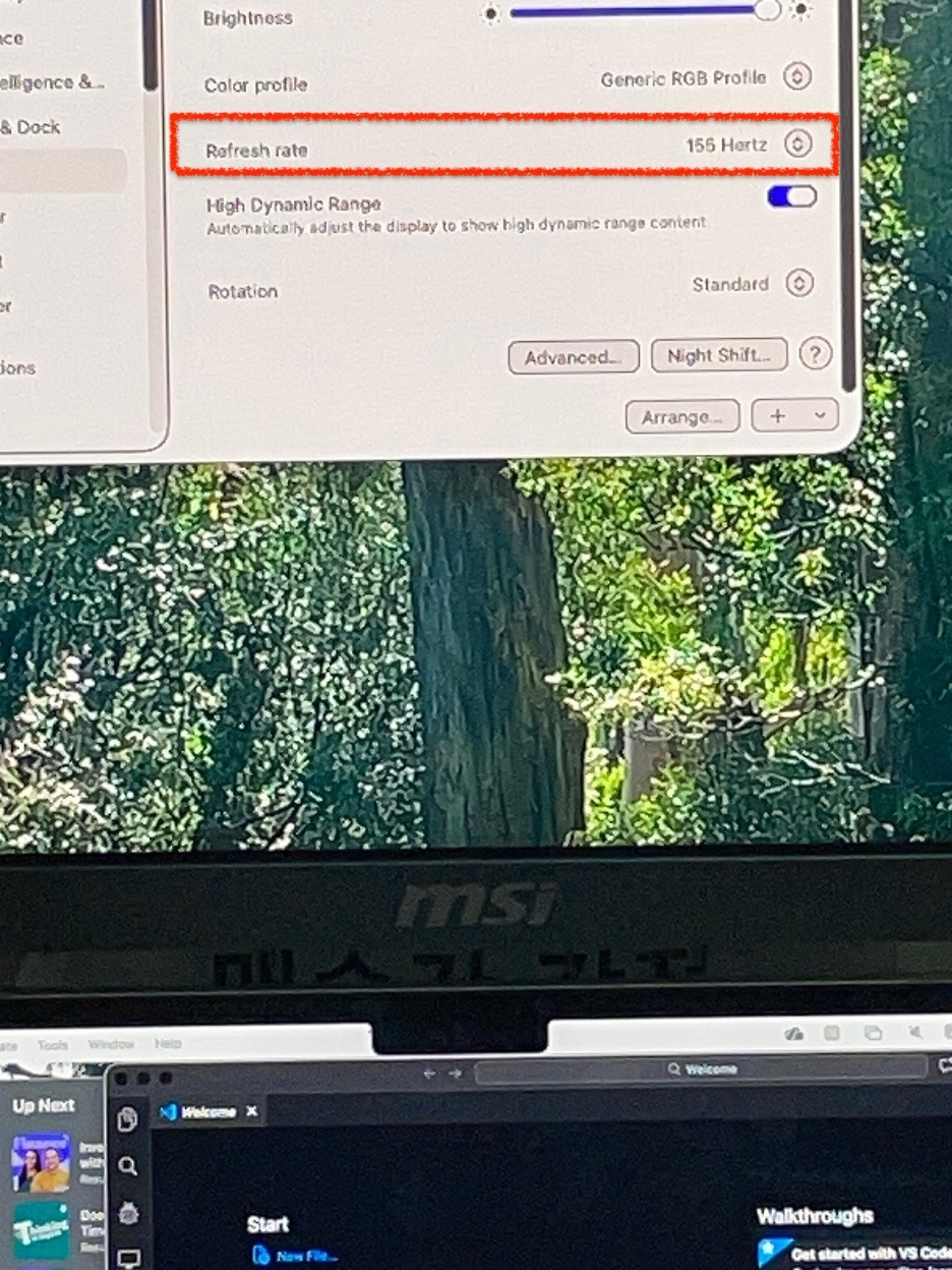 구매한 케이블로 전송 대역폭(Bandwidth)과 처리량(Throughput)의 한계량을 80 Gbps(기가 비트/세컨드)로 남아돌게 늘리니, 이전 HDMI 케이블로 모니터와 맥북을 연결했을 때처럼 끊김 현상이 전혀 발생하지 않았다. 또한 아래 사진처럼 155 Hertz(헤르츠) 주사율로 넓은 화면의 해상도를 뿌릴 수 있다(Refresh rate).