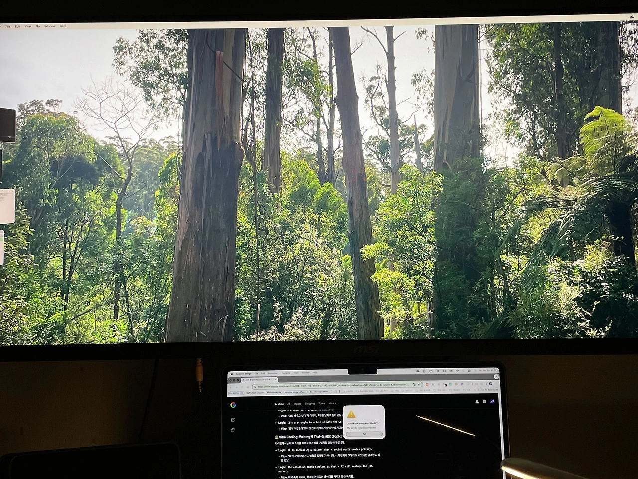 일단 필자의 화면 출력 구성 요소는 아래와 같이 애플 맥북에어 M4와 아이패드 프로 9세대, 그리고 MSI MAG401QR 모니터다.