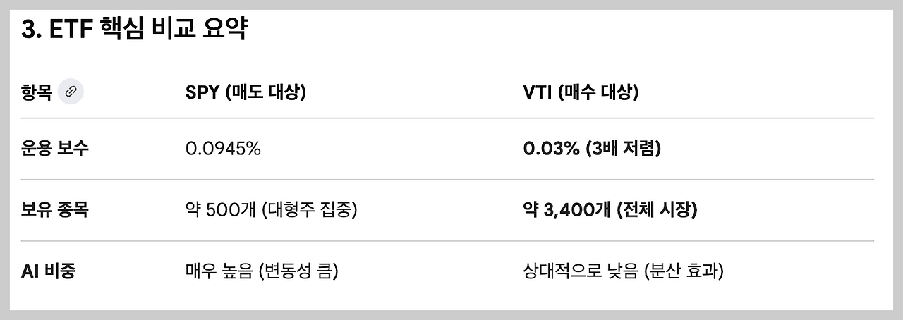 SPY에서 VTI로 옮기는 것은 결국 '초대형 기술주 집중'에서 '미국 전체 시장 분산'으로 포트폴리오 성격을 바꾸는 것입니다.