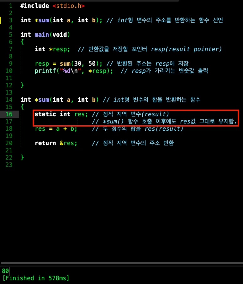 위와 똑같은 소스 코드이지만, *sum() 포인터 함수 내부에서 res 변수를 위와 달리 static(정적 지역) 변수로 선언하지 않았기 때문에 이 함수 내부 영역(scope)에서만 사용이 가능하다. 그래서 실제로 힙메모리(프로그램 전체 실행 중 사용)에 할당되지 않고, 스택 메모리(지역변수)에 할당되어 경고메시지를 띄운다. 지역 변수는 특정 함수 블록 안에 변수를 선언하여 필요한 경우 잠깐 사용하고 메모리를 재활용하는 효과를 볼 수 있다.