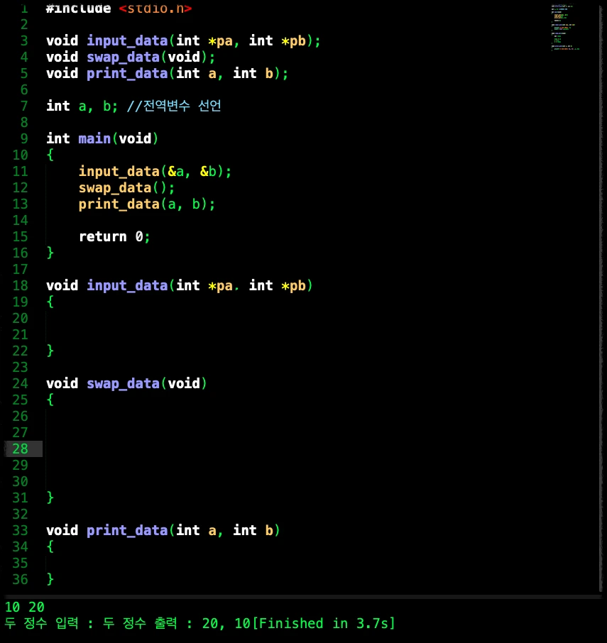 2개의 전역 변수에 값을 입력하고 교환한 후 출력하는 프로그램을 작성합니다. 입력, 교환, 출력 작업은 다음에 제시된 함수 원형을 지켜 작성합니다.