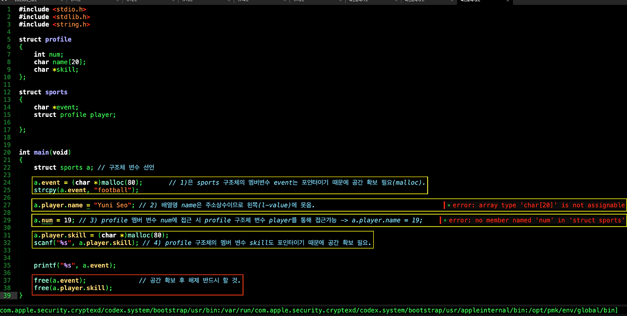 다음 소스코드과 같이 구조체가 선언되어 있을 때, 아래 구문들 중 잘못 사용한 것을 찾고 그 이유를 적으세요.