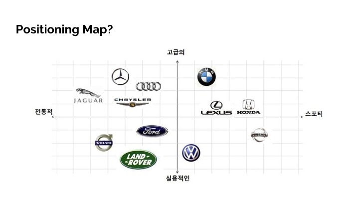 위 그래프에서 렉서스가 고급인지/실용적인지, 스포티한 지/전통적인지 어떻게 알 수 있을까요? 실제로는 이를 판단할 정교한 질문들을 설계해서 고객들에게 설문조사 등을 실시해서 각 attribute을 점수화하게 되는데... 어렵습니다. 시간과 돈이 들지요... 그리고 애초에 위 그림은 정교한 수치 분석을 통해 나온 그래프라기보다는 추상적으로 그린 conceptual chart로 소통될 때가 많습니다. 그러다 보니 가라(?)로 진행할 때는 윗사람들이 동의할만한 범주 안에서 실무자들이 적당히 주관적으로 찍어서 그리기도 합니다... (혹시 보고를 받는 입장에서 확인해보고 싶으면 이 포지셔닝 맵에 대한 근거 데이터를 보여달라고 해보세요)