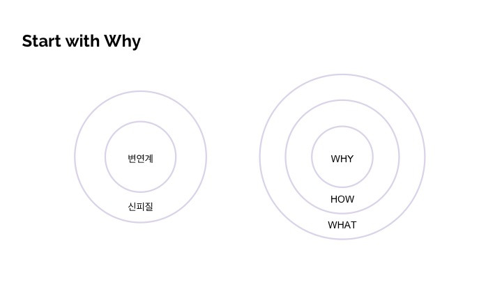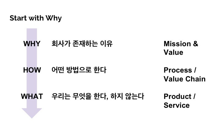 이 두뇌의 구조를 놓고, 유명한 TED 강사이자 여러 책들의 저자인 사이먼 사이넥(Simon Sinek)은 '나는 왜 이 일을 하는가?*'에서 기업이 고객(외부고객과 내부고객(직원) 모두)을 설득시키려면 WHY - HOW - WHAT 순서로 접근해야 한다고 말합니다. 즉 이 회사가 왜 존재하여야 하는지, 어떤 가치를 제공할 것인지가 먼저 뚜렷해야 하고, 그리고 그 가치를 어떤 방법으로 기존 player들과 다르게 제공(혹은 기존에 없던 것을 제공)할 것인지, 그래서 구체적으로 어떤 제품/서비스를 제공하겠다는 것인지의 순서로 설득해야 신피질이 아니라 변연계를 설득할 수 있다는 것이죠.