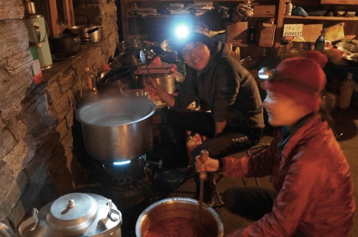 네팔리 쿡이 세팅해놓은 주방에 들어갔다. 주방이랄 것도 없었다. 빈 공간에 집기 몇 가지 들여놓은 것이 전부였다. 너무 어두워서 헤드랜턴을 썼다. 내가 할 수 있는 언어는 한국말과 영어 몇 마디뿐이었고, 그들은 네팔리 외에는 전혀 알아듣지 못했다. 내가 손짓 발짓으로 이야기하면 그 모습이 귀엽다는 듯이