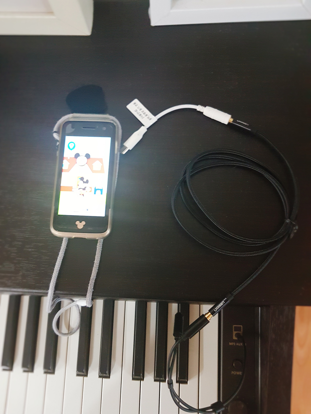 초등학교 3학년인 첫째딸의 키즈폰, 핸드폰은 USB C타입이고 음향 연결 케이블이 별도로 있다.