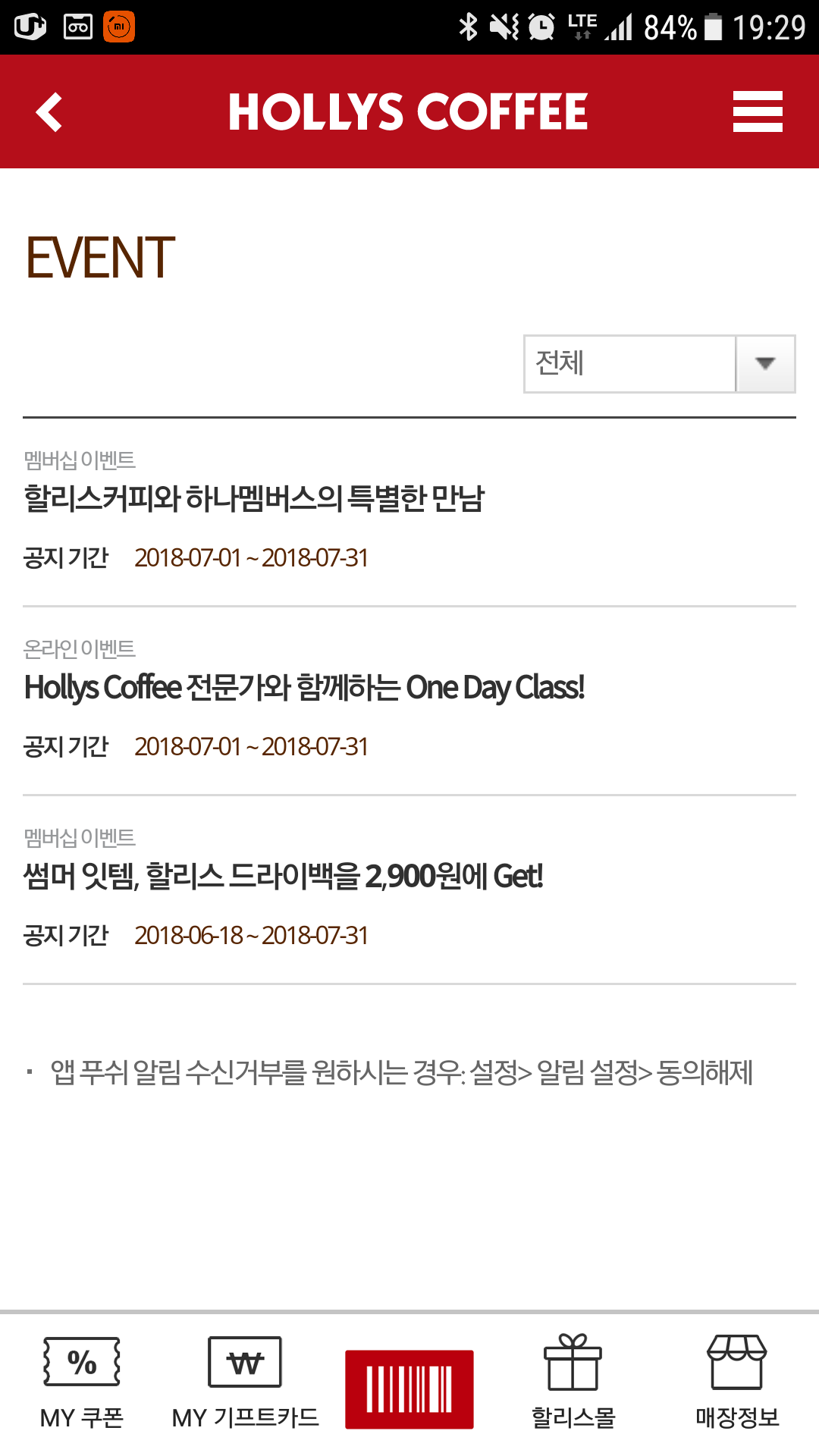 할리스앱에서 이벤트 알람