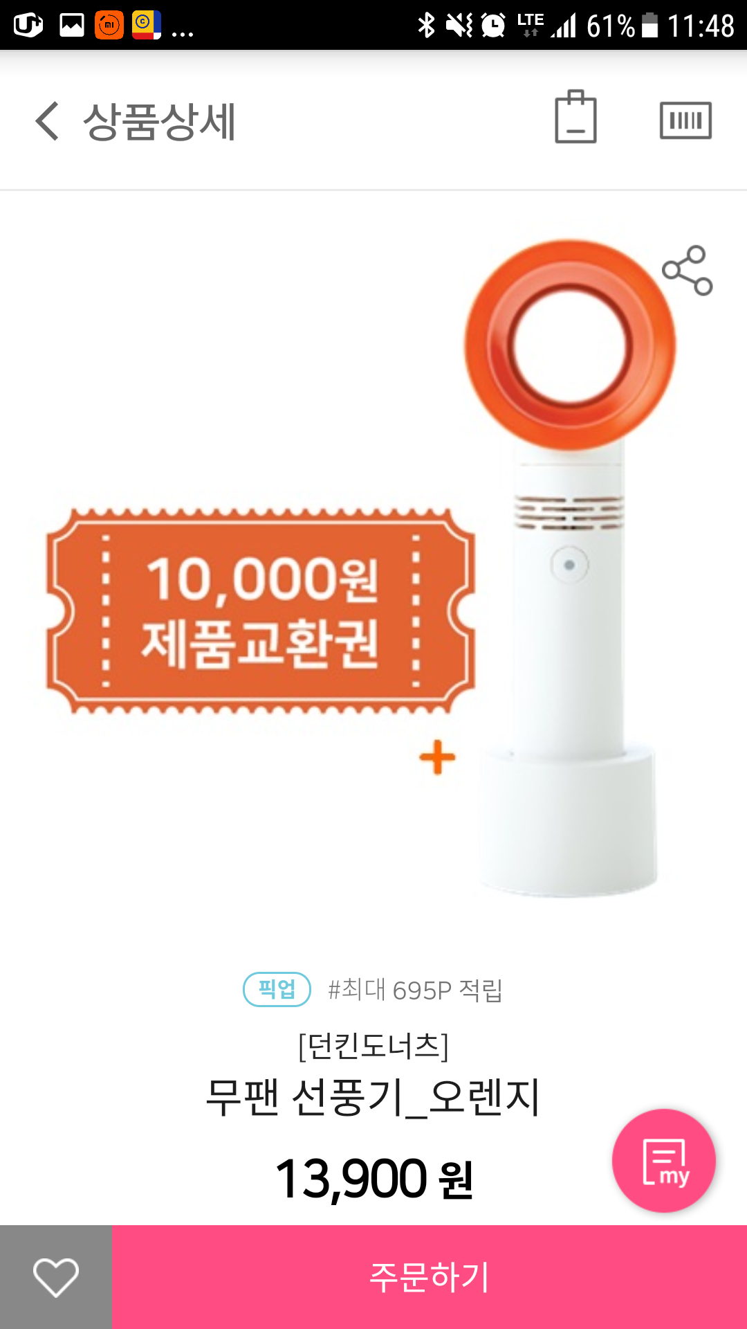 무팬 선풍기가 3,900원 만원 제품교환권이 더해져서 13,900원이다.