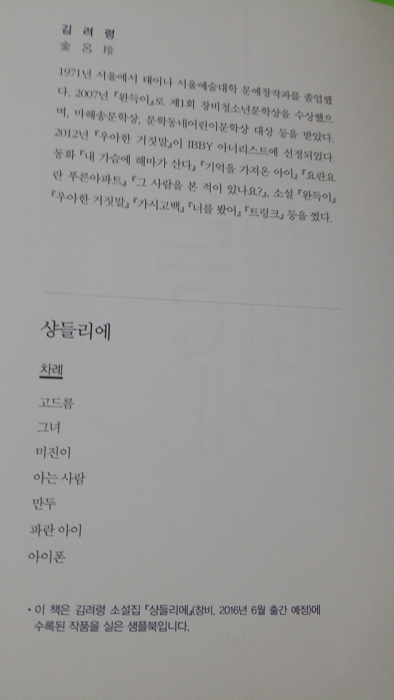 김려령의 "샹들리에" 신간이 나온다. 페이스북, 책읽기당에서 "단편하게읽기"을 신청하여 출간 예정 수록 된 작품을 샘플북으로 미리 받았다.